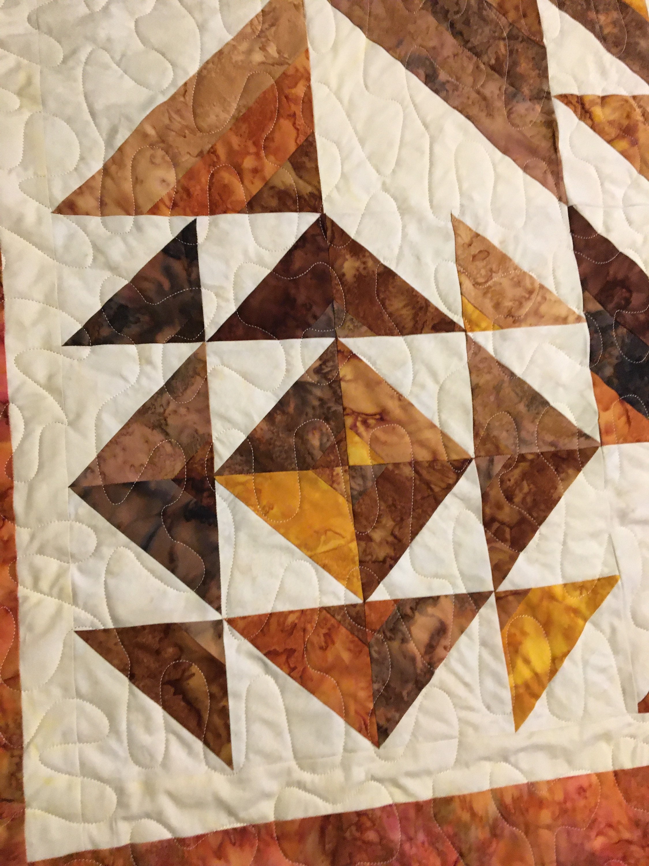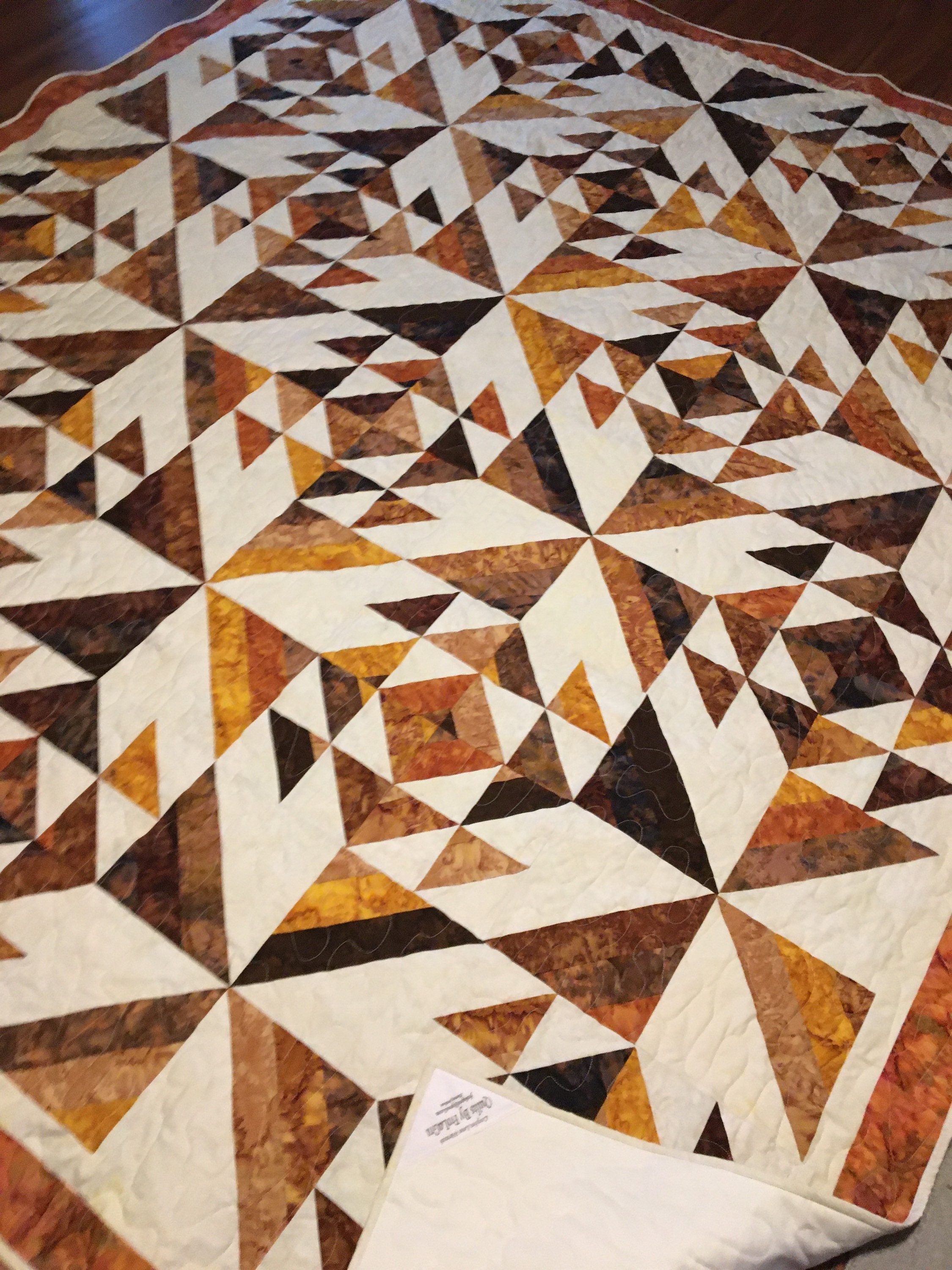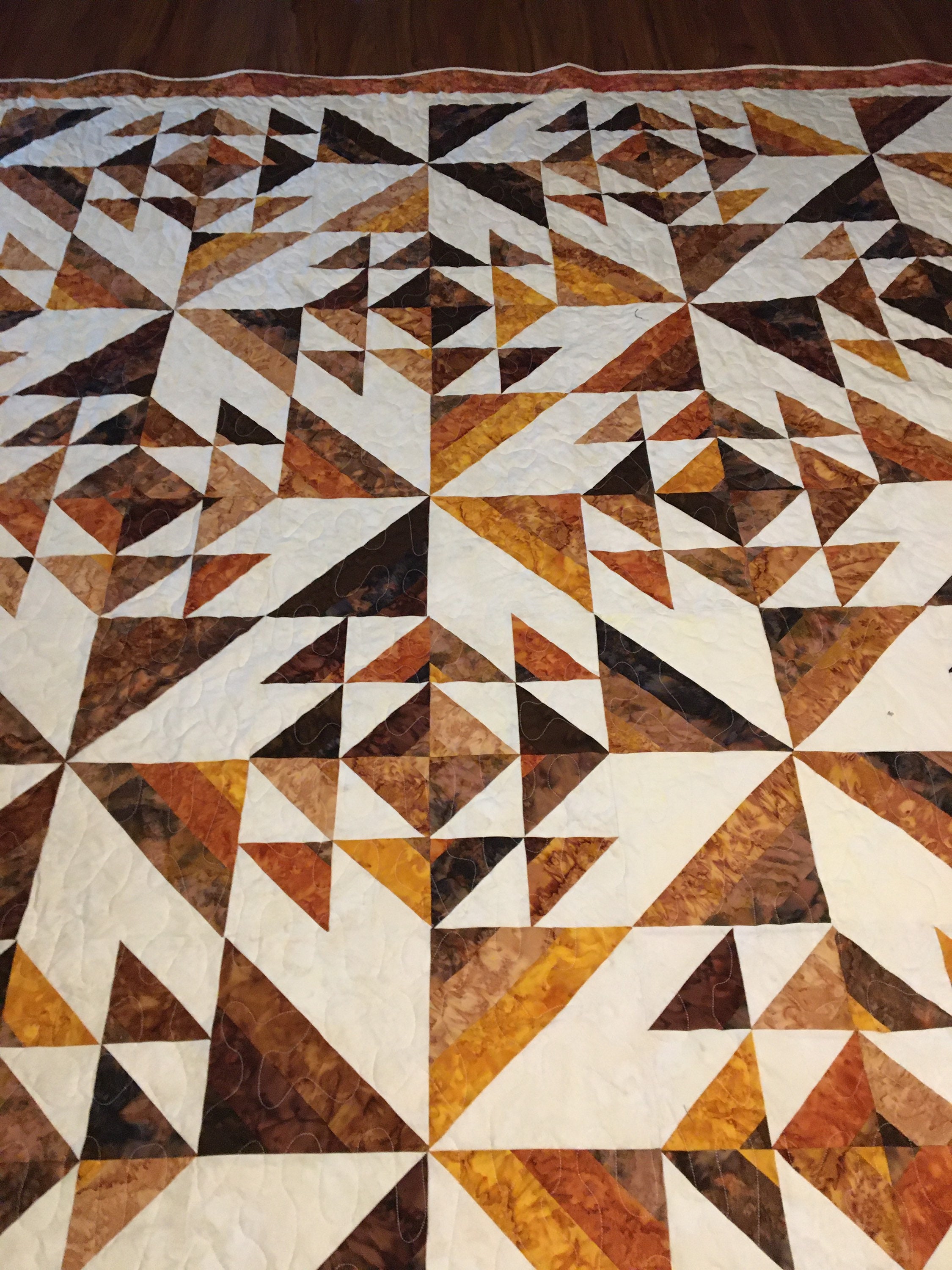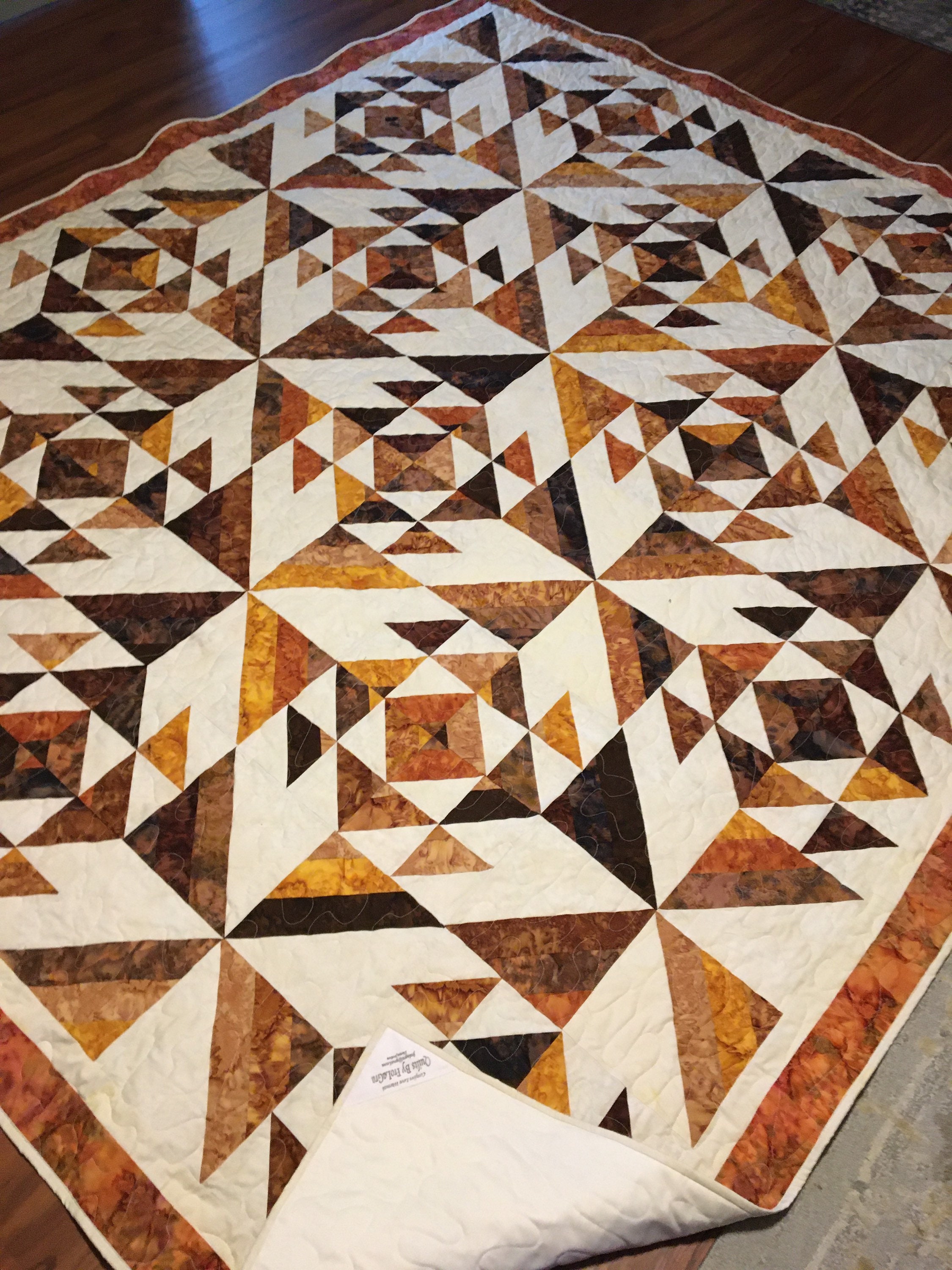 I love working with batik fabric and this earthy line by Hoffman fabric is a great example. This is a long queen quilt made using exclusive batik fabrics for the quilt top. The all cotton batting and the top sandwiches warm and natural cotton batting for light weight, warmth and breathable fabric. This measures 82 x 103”.