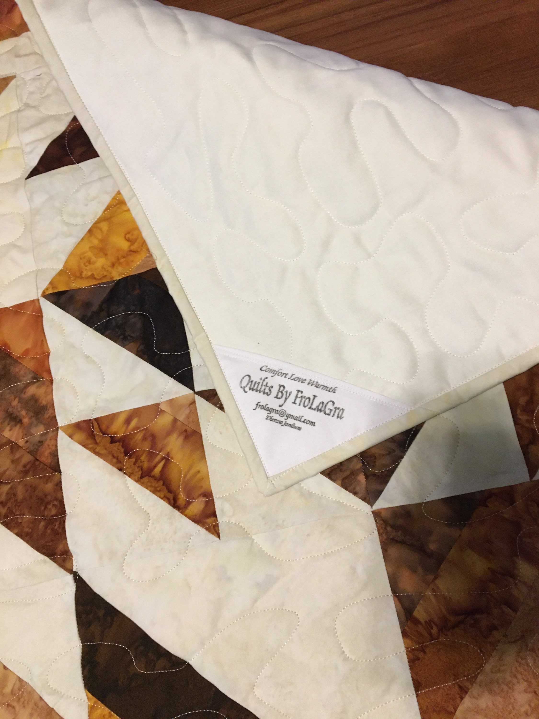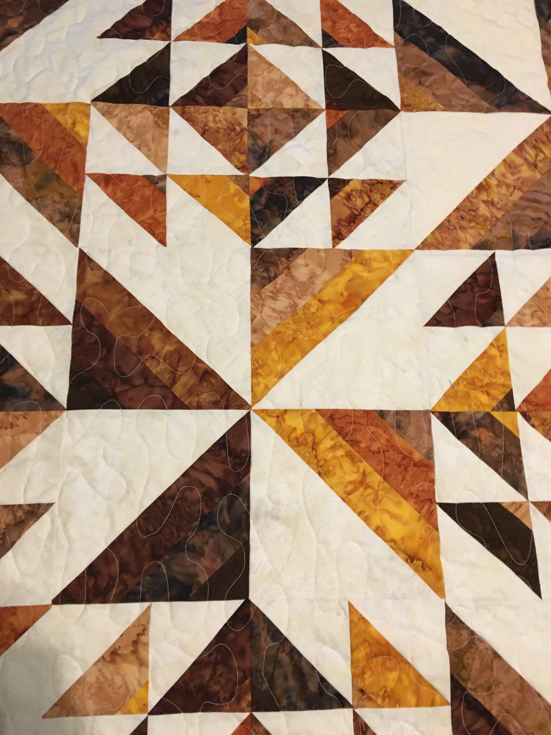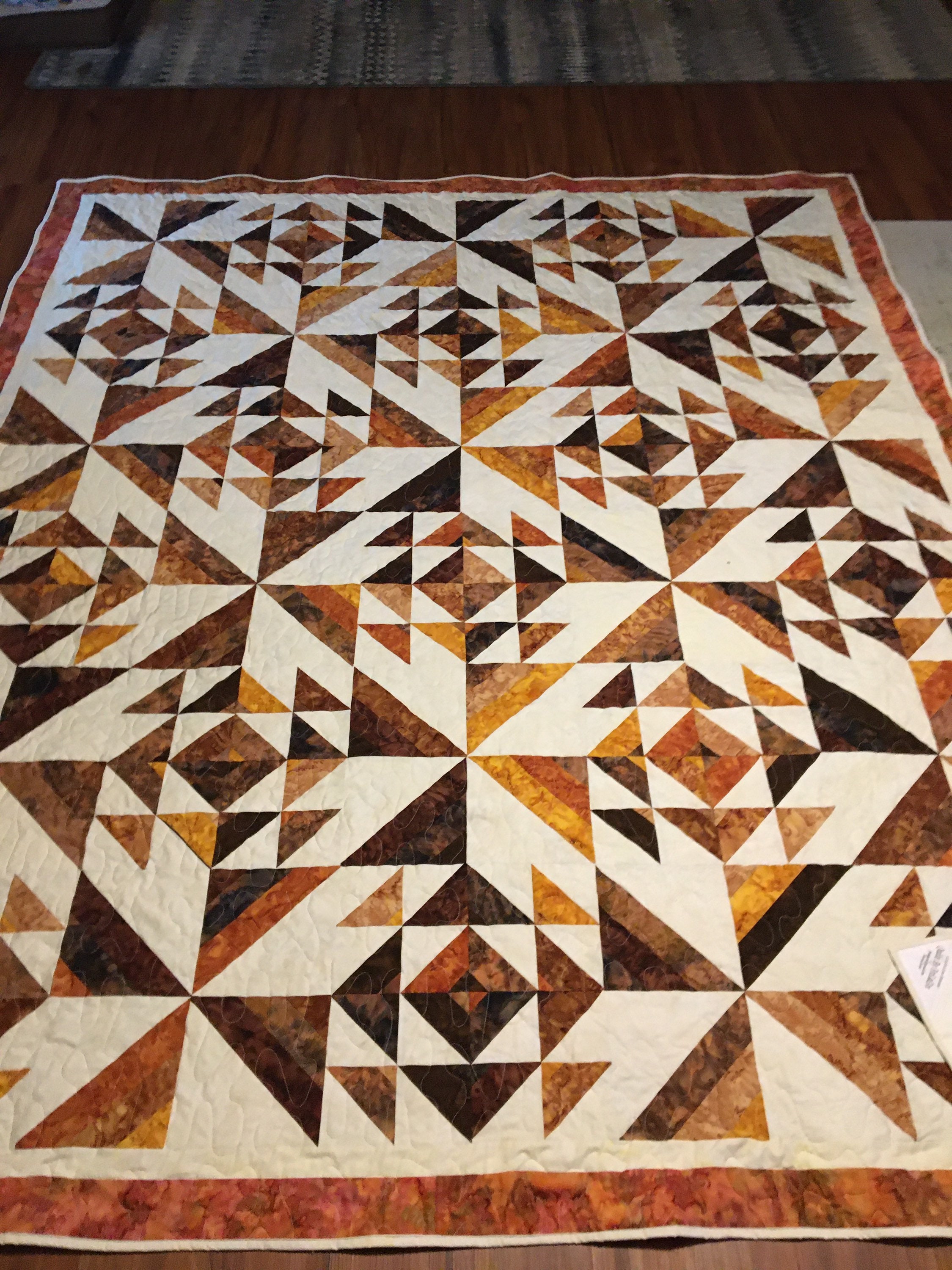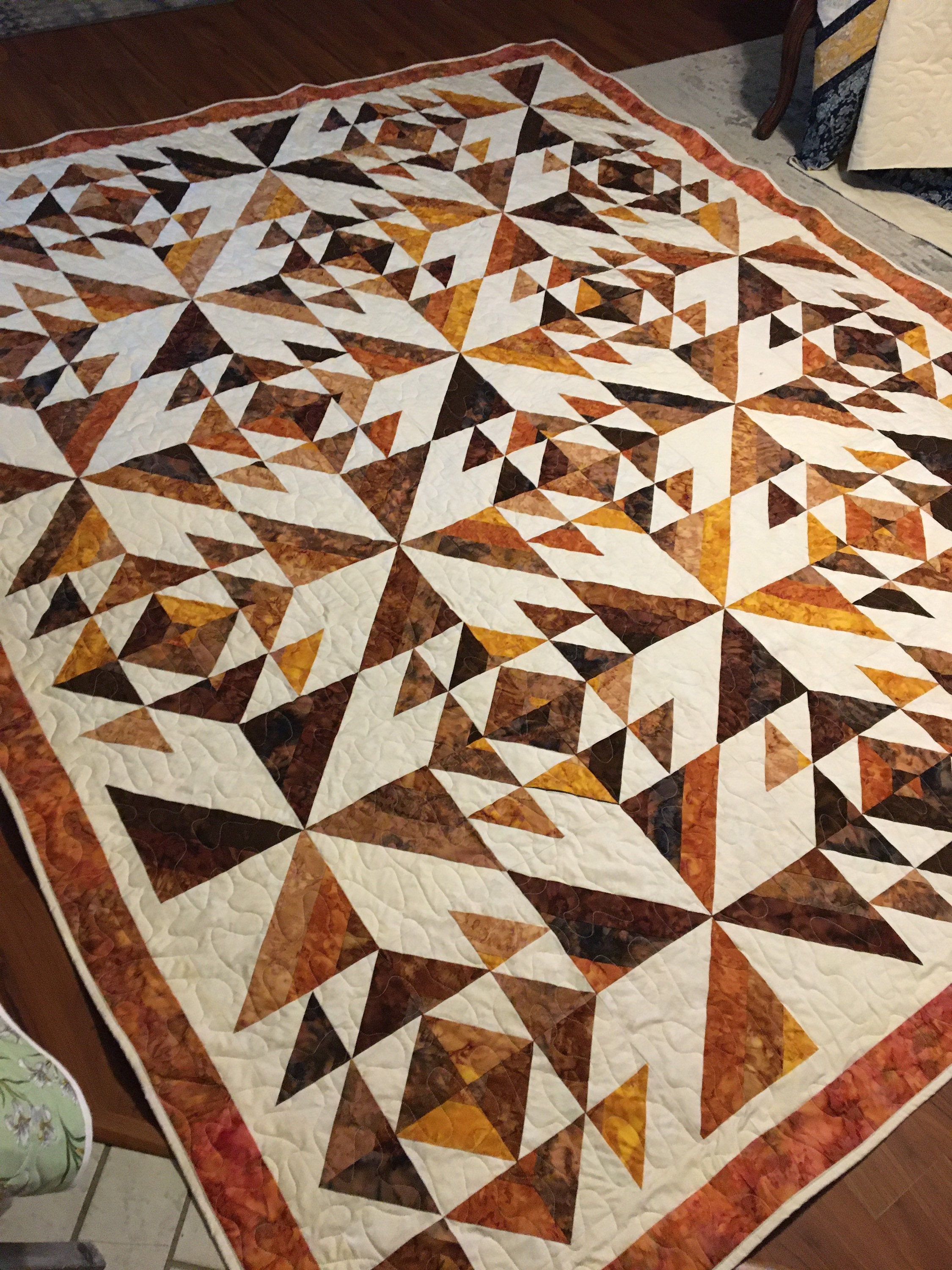 I love working with batik fabric and this earthy line by Hoffman fabric is a great example. This is a long queen quilt made using exclusive batik fabrics for the quilt top. The all cotton batting and the top sandwiches warm and natural cotton batting for light weight, warmth and breathable fabric. This measures 82 x 103”.
