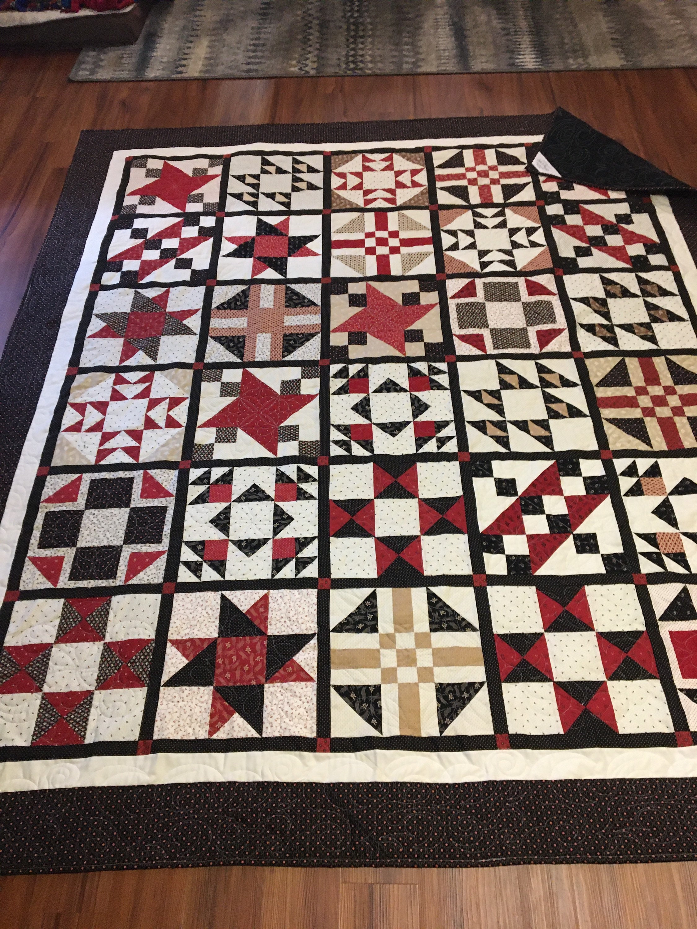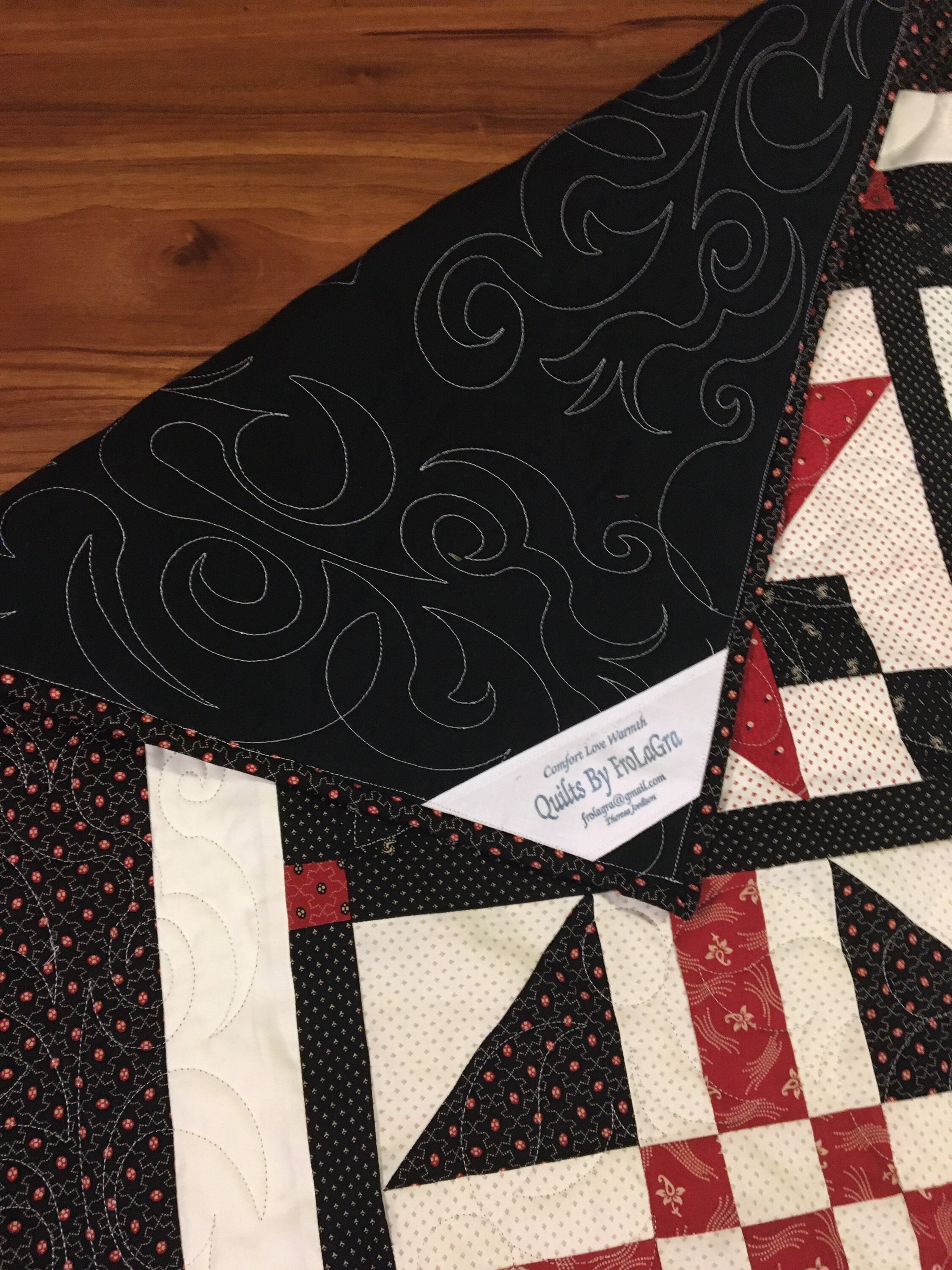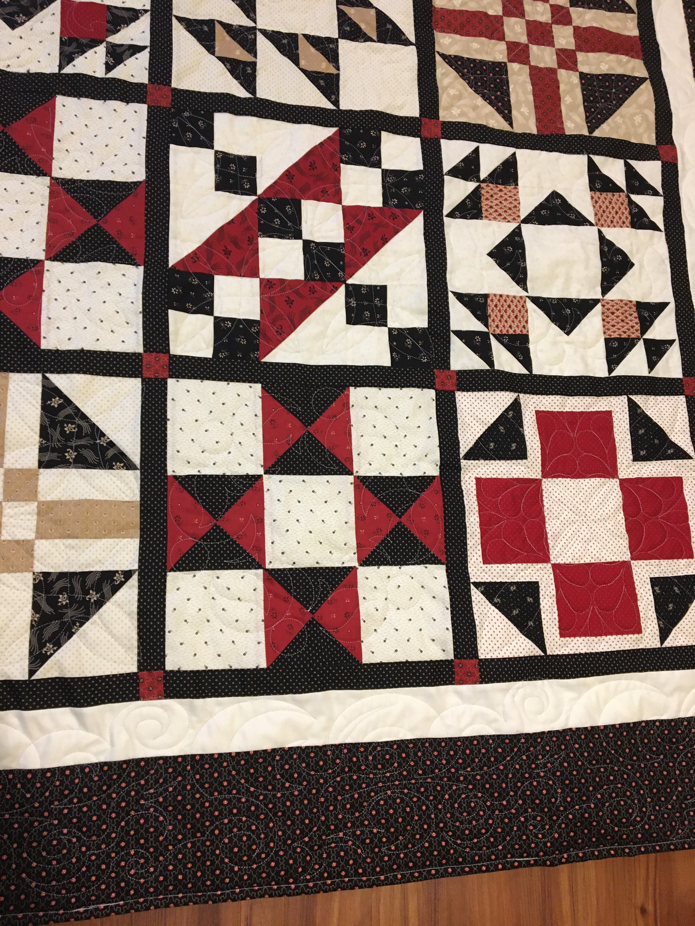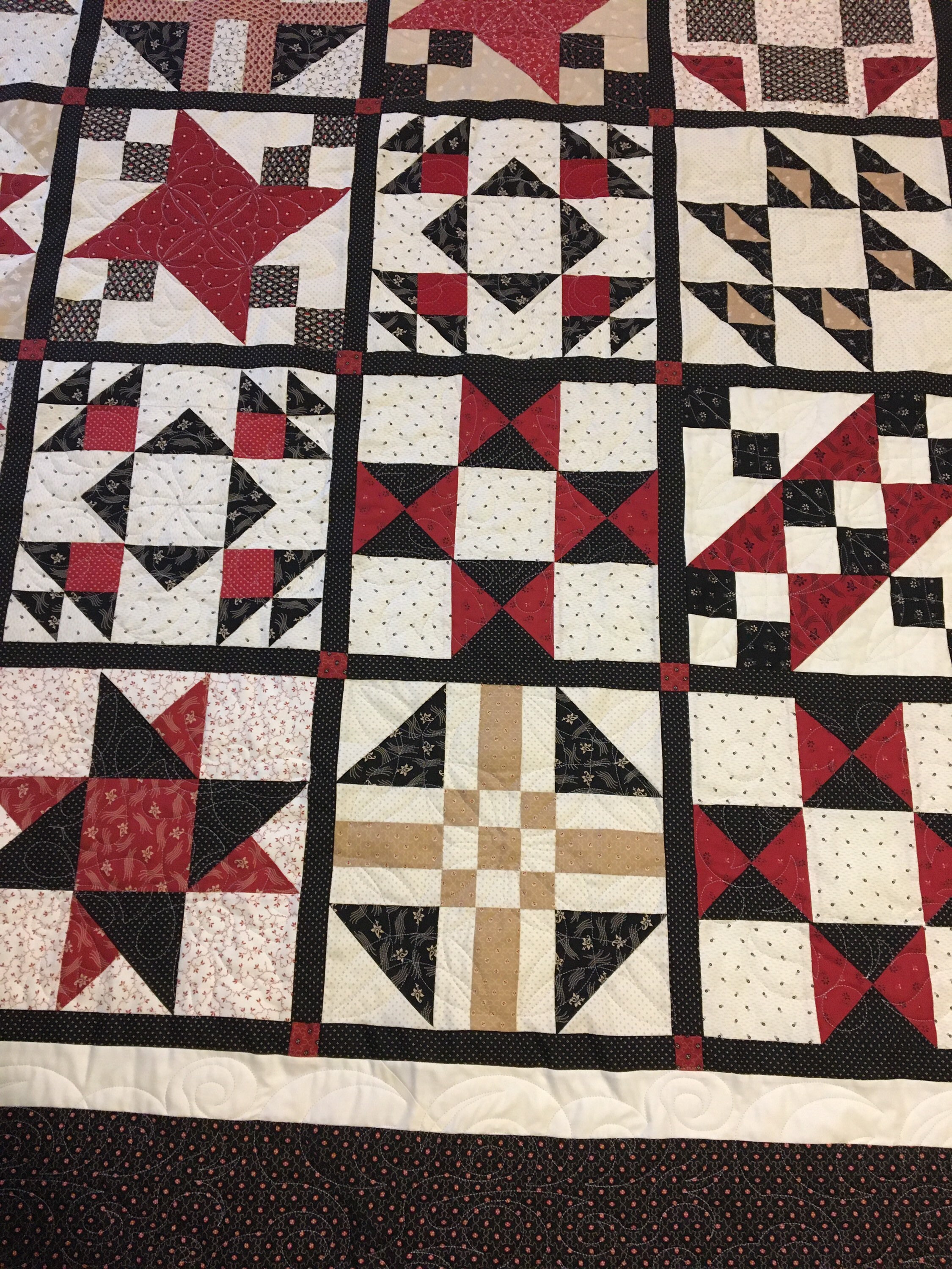 I so enjoyed making and quilting this quilt. It uses fabrics by Riley Blake and sashed 12” blocks to form this queen size quilt. I used a solid black backing and cotton batting. It will provide decades of warmth! Dimensions 81”x 94”