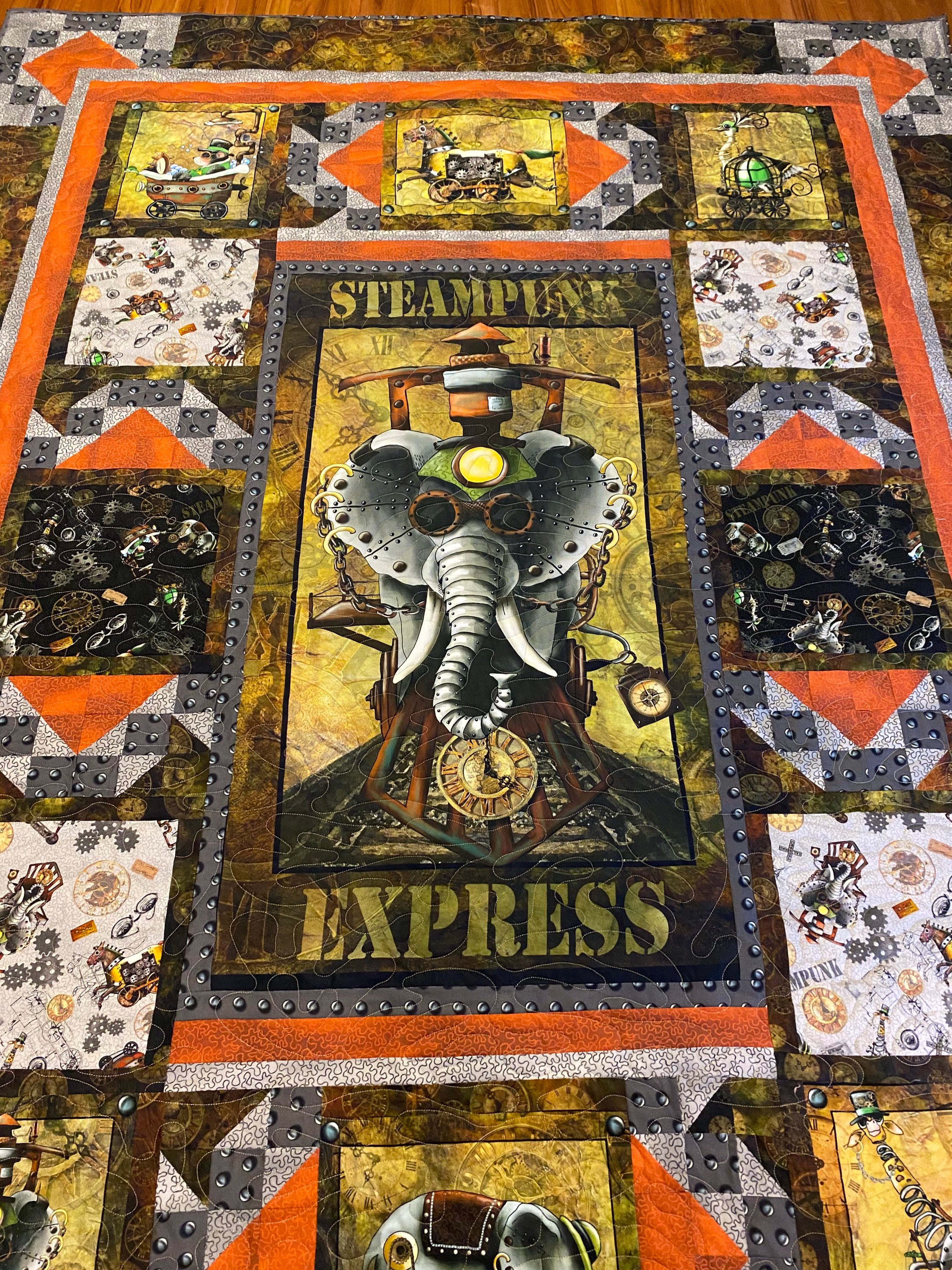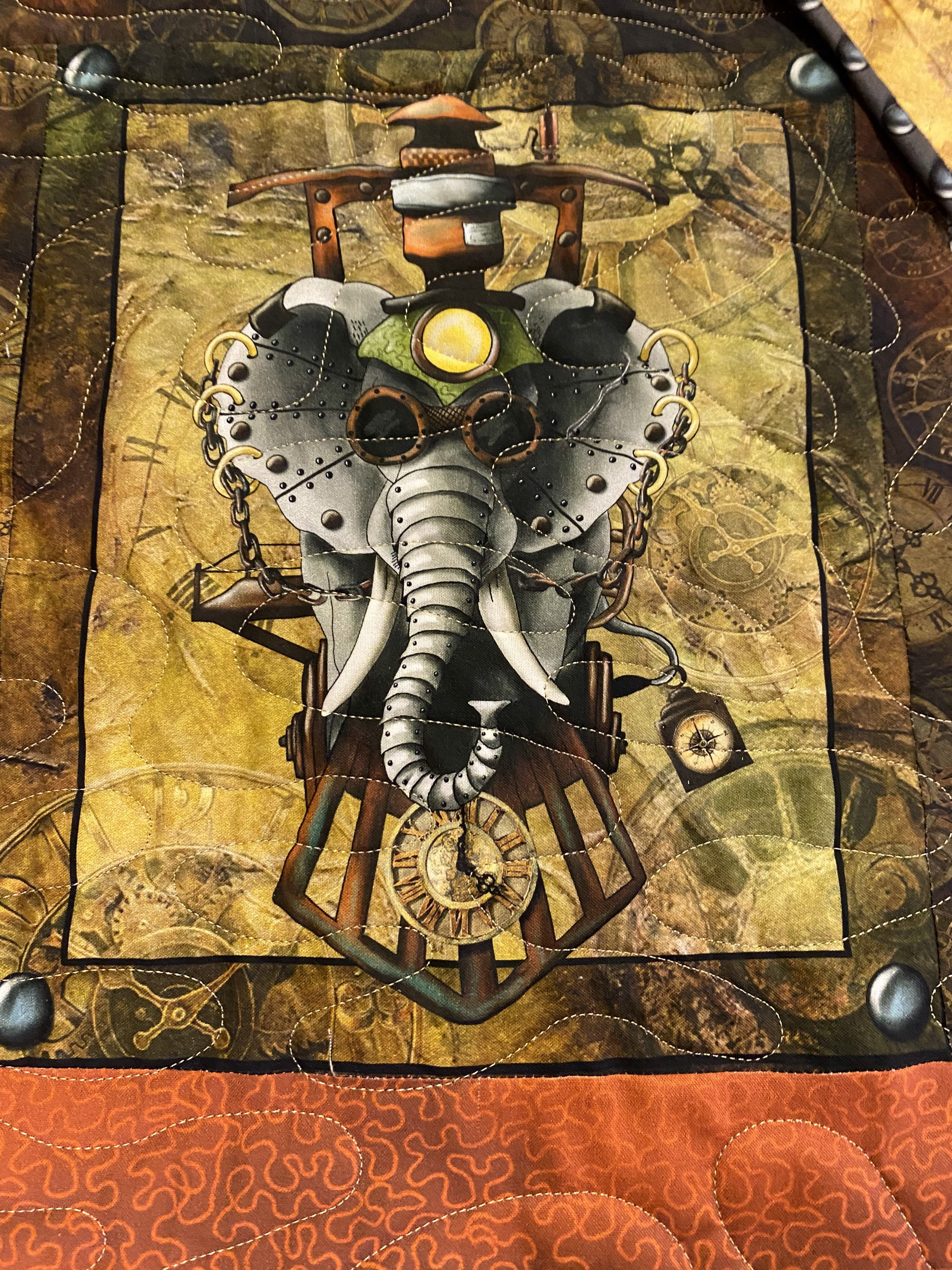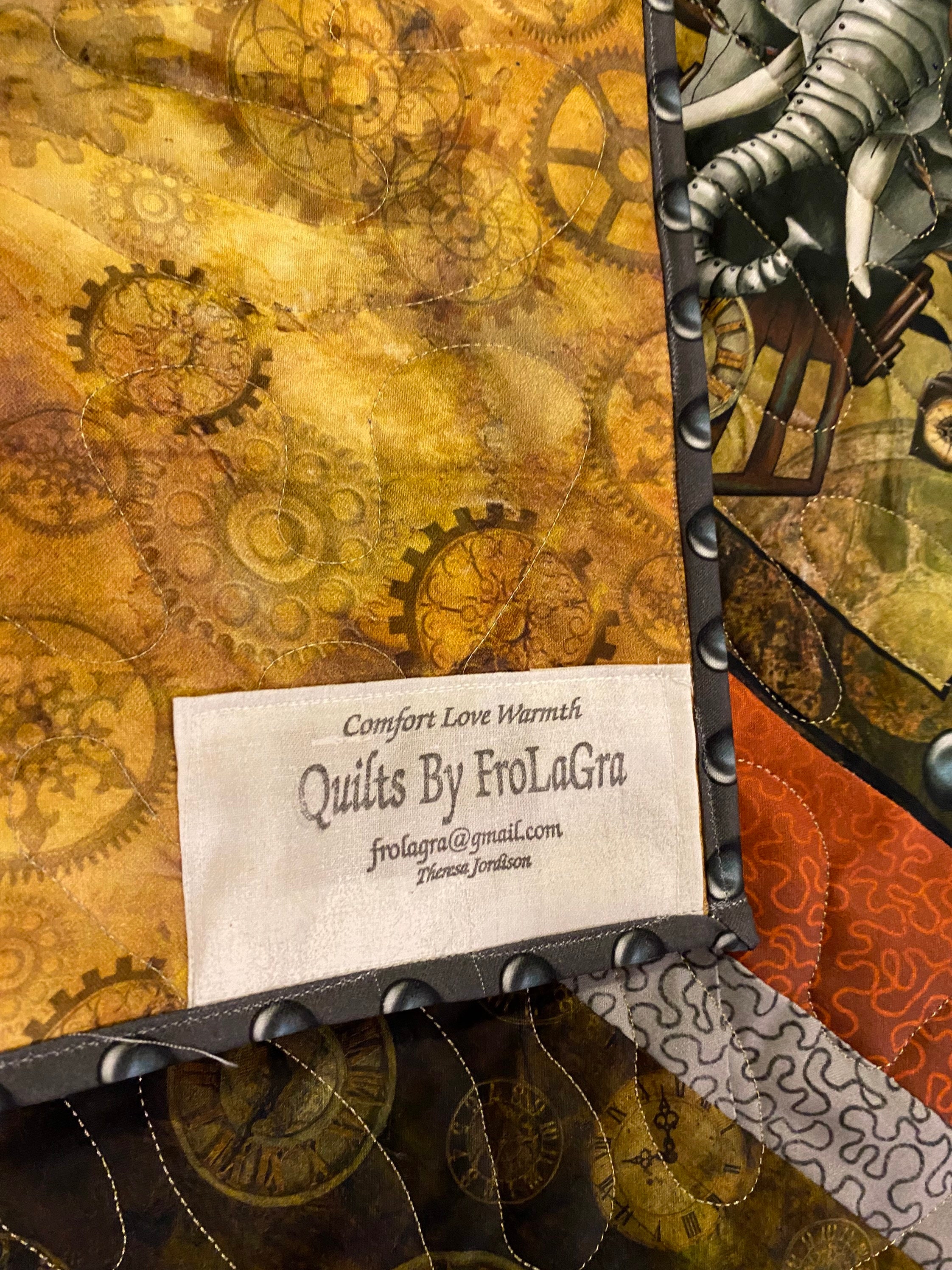 Elephants with goggles. I love it! This is a twin size Steampunk design quilt. I love the SciFi and animals mixed together! It is finished with a gold and brown GEARs backing and cotton batting.