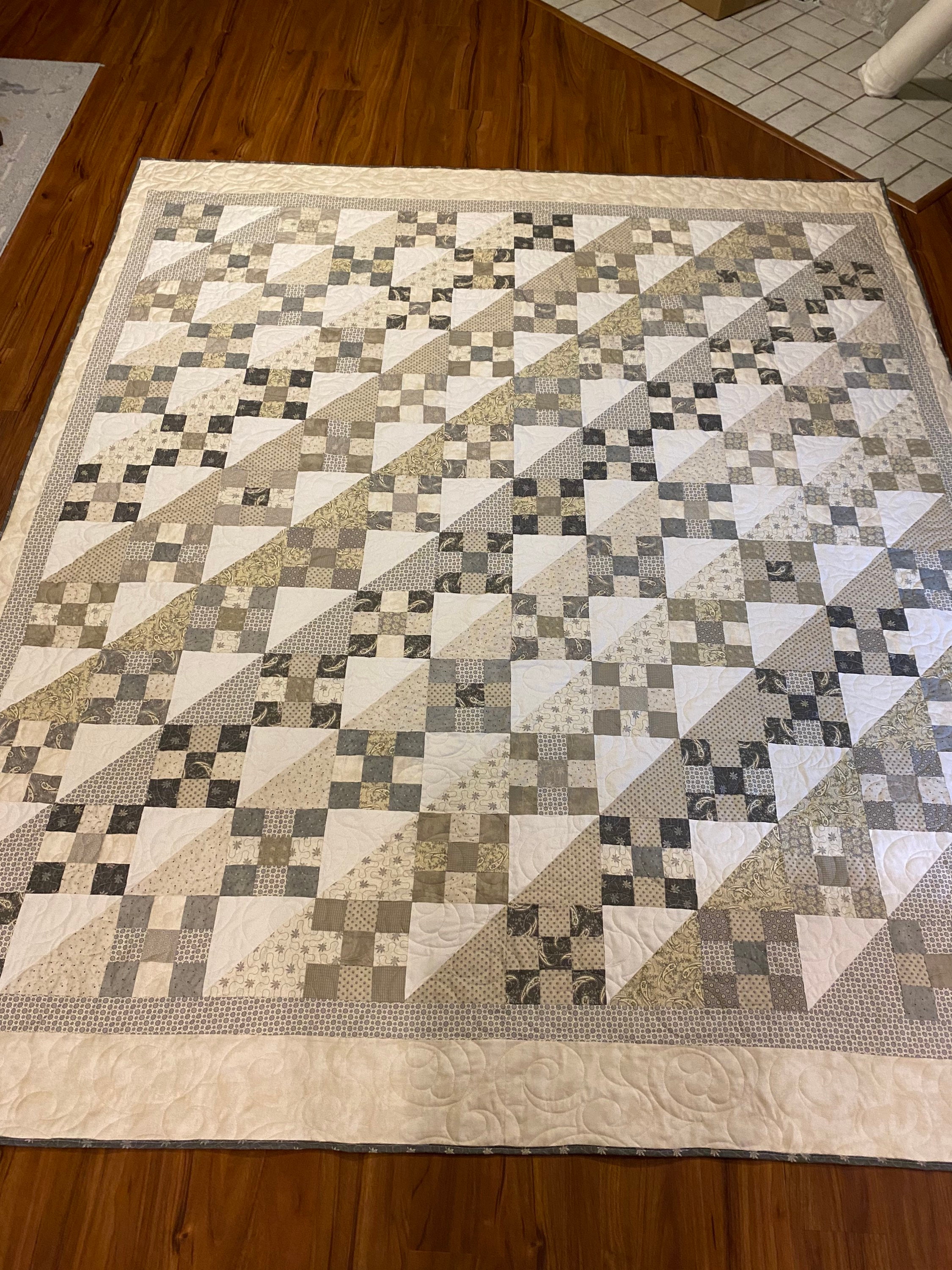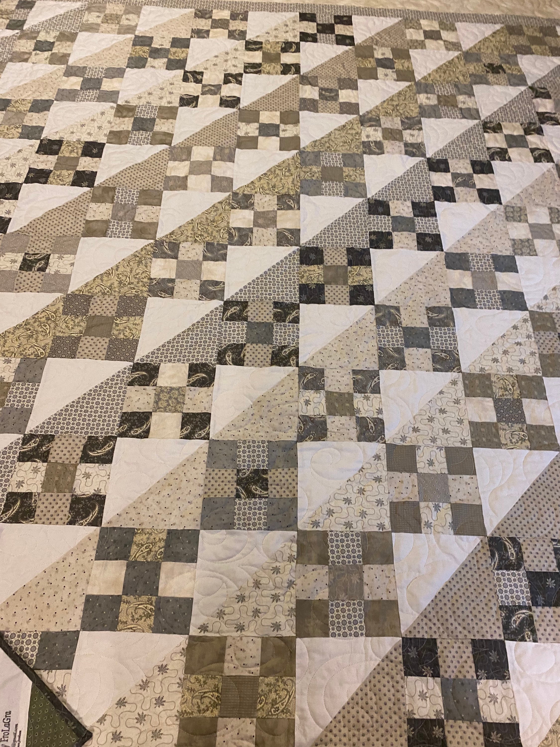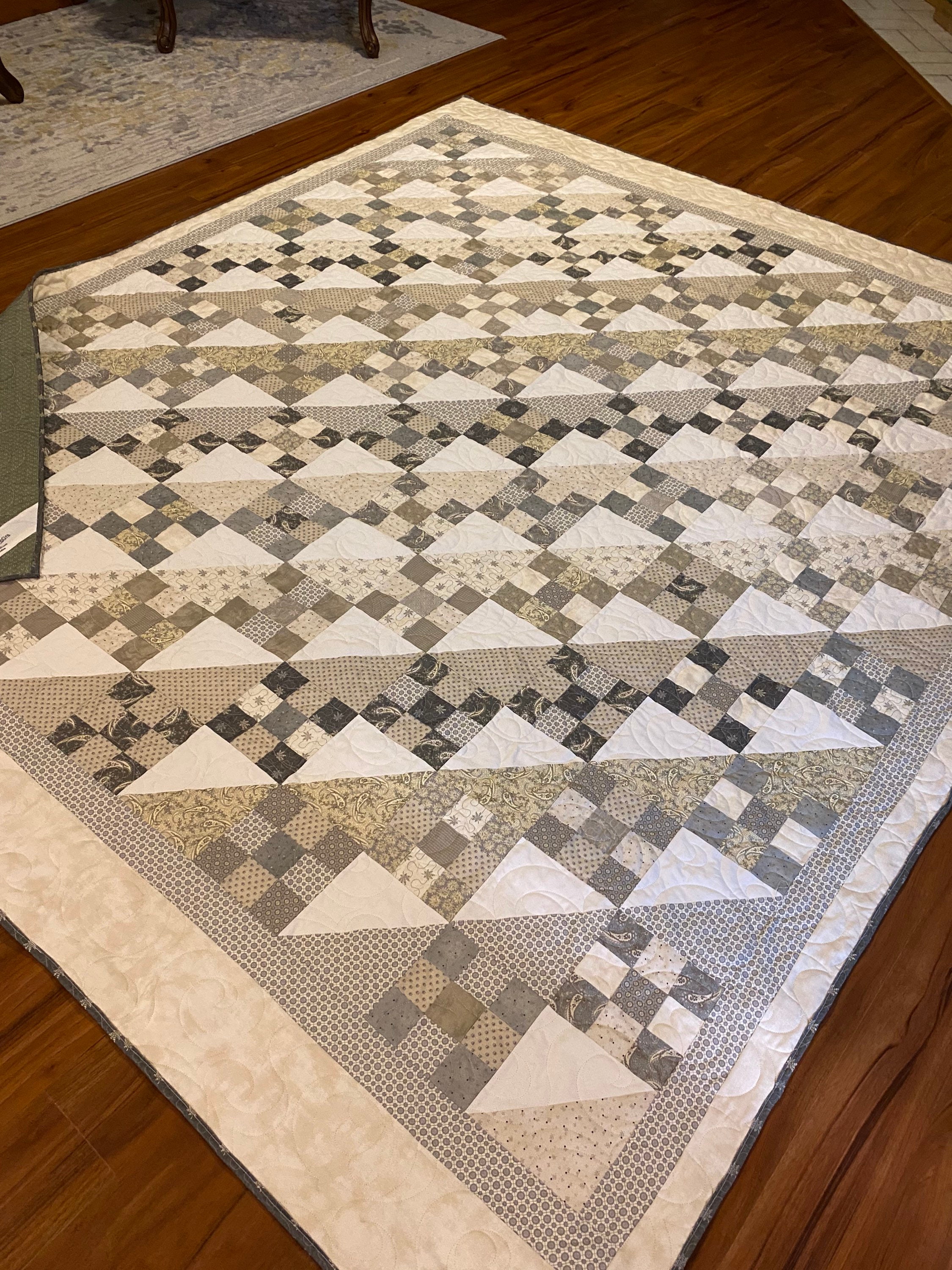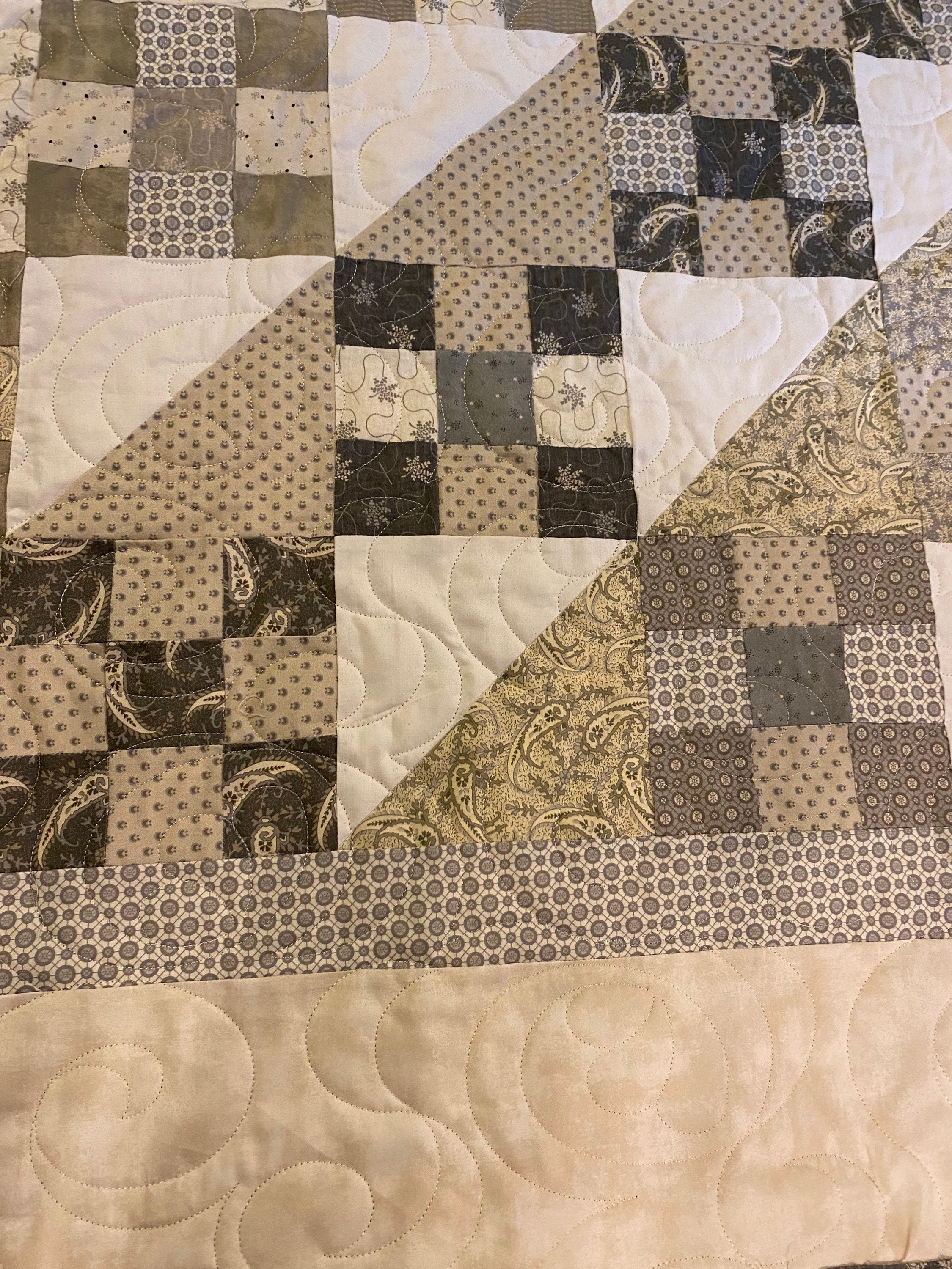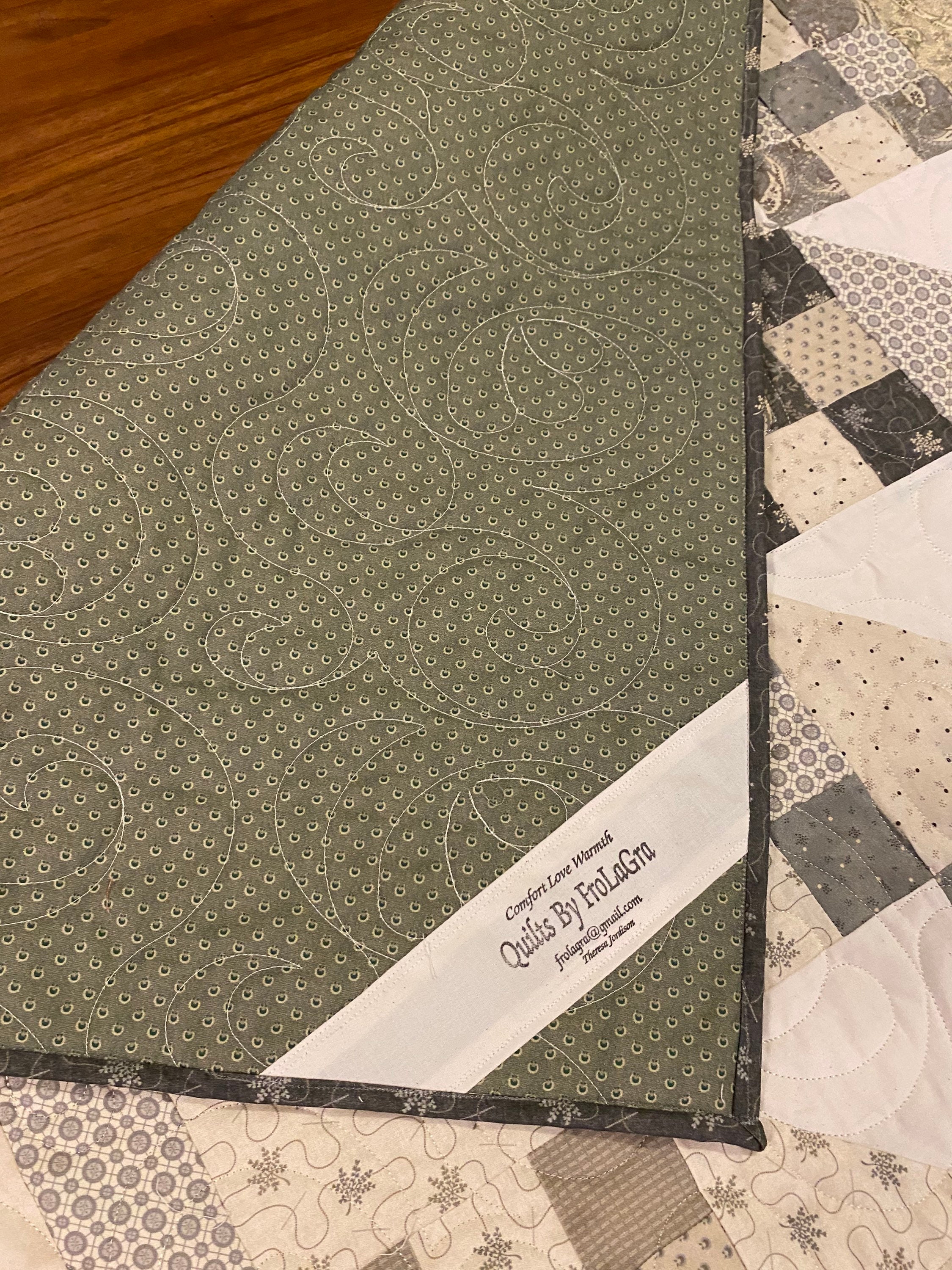 I used cotton batting and a coordinating sage backing to complete this beautiful quilt. Decades of use and softness for you!
