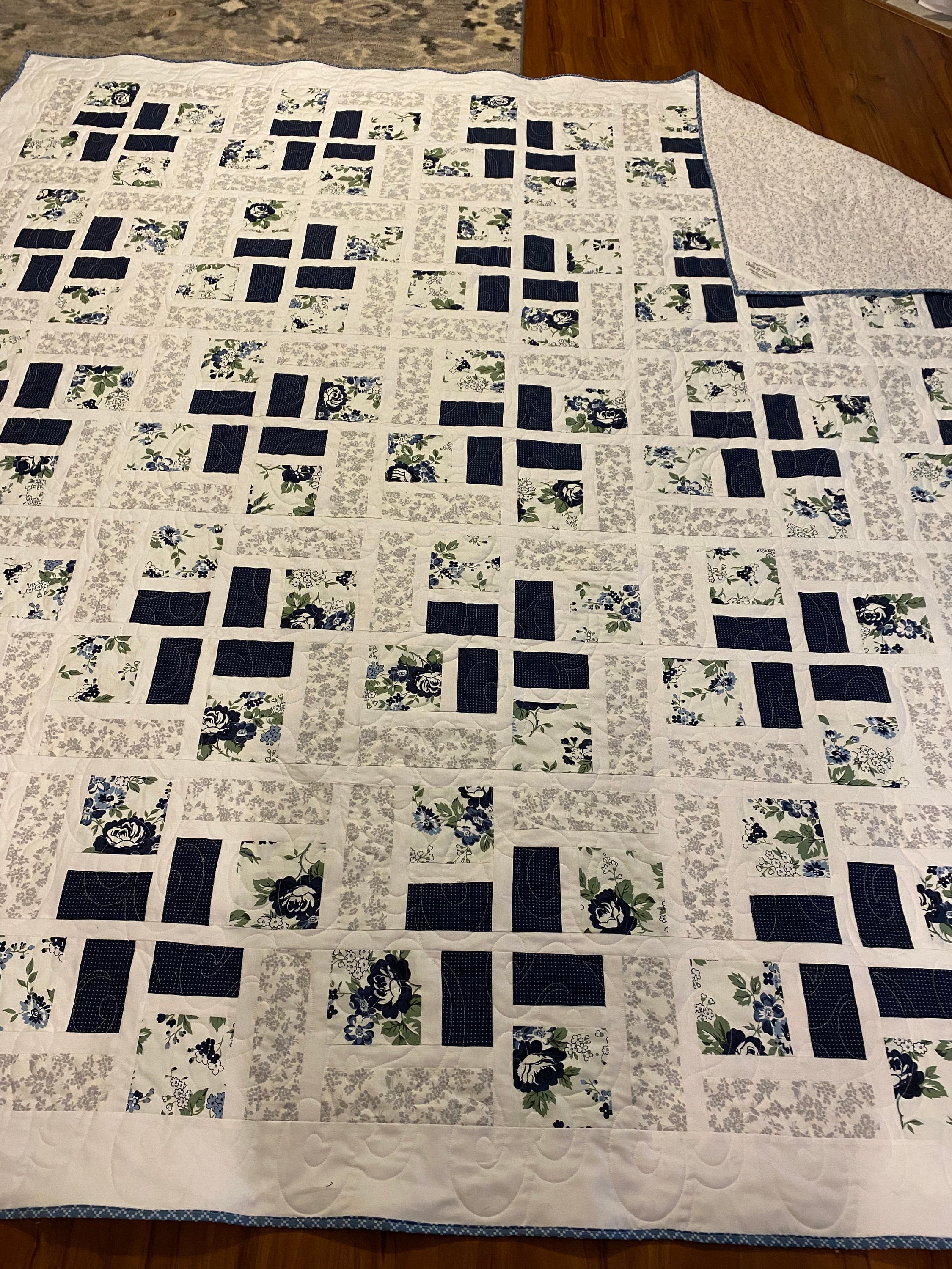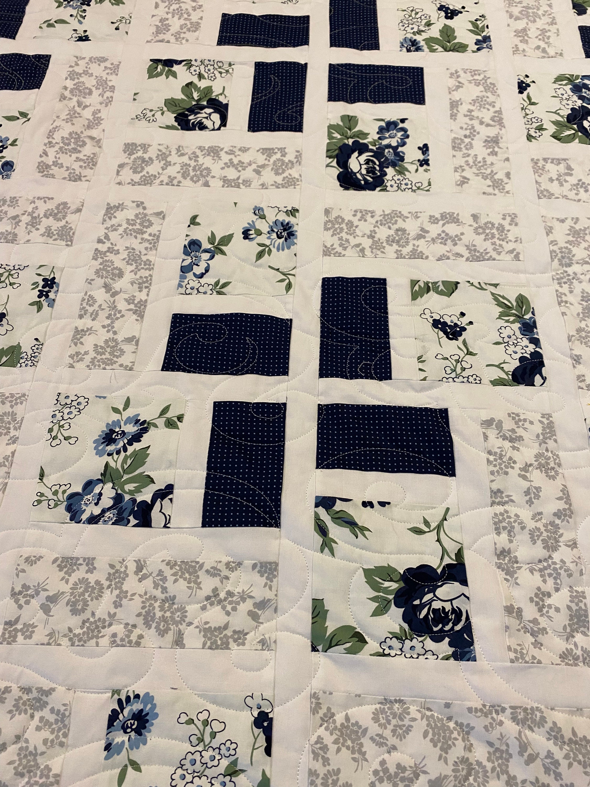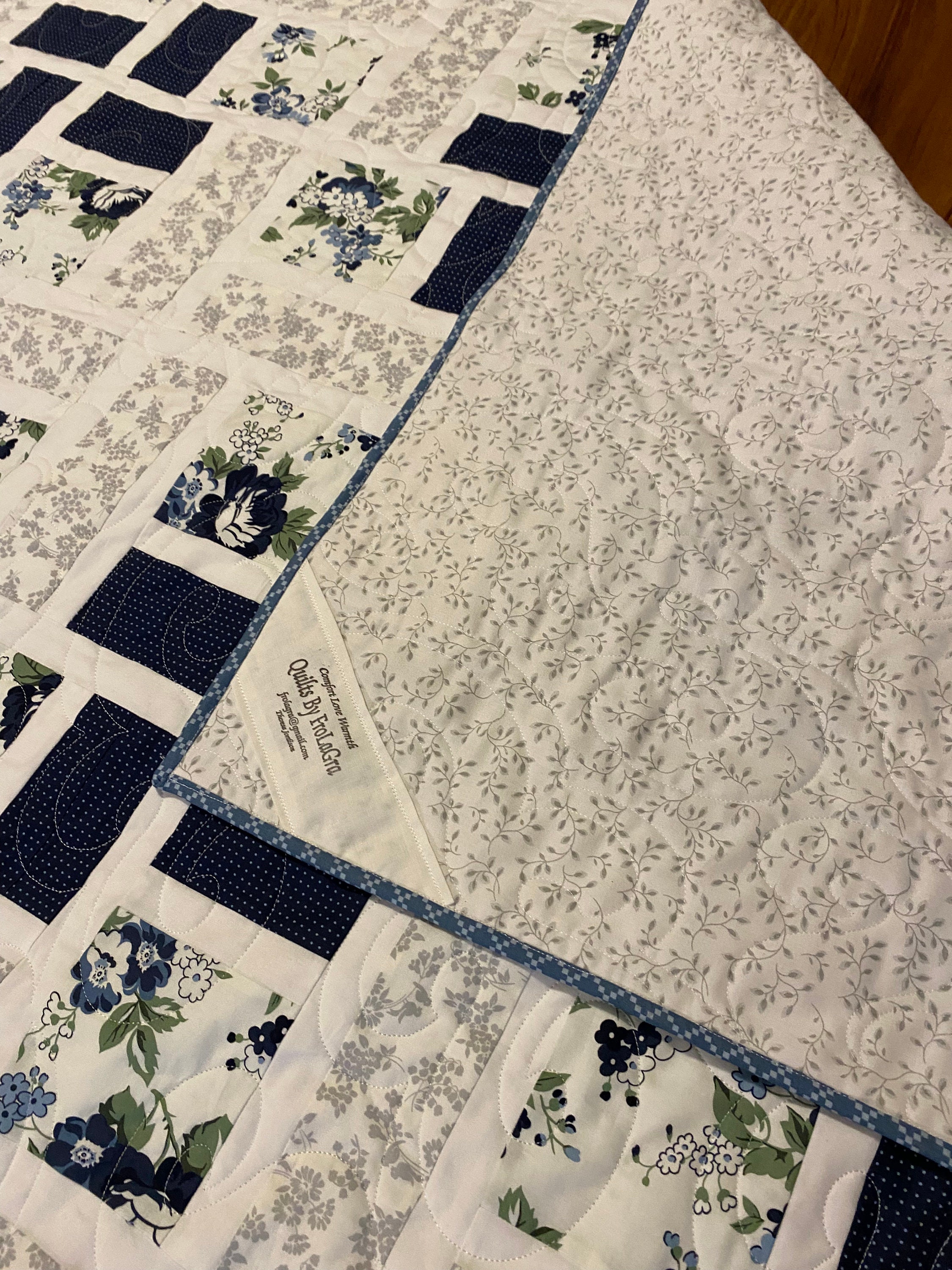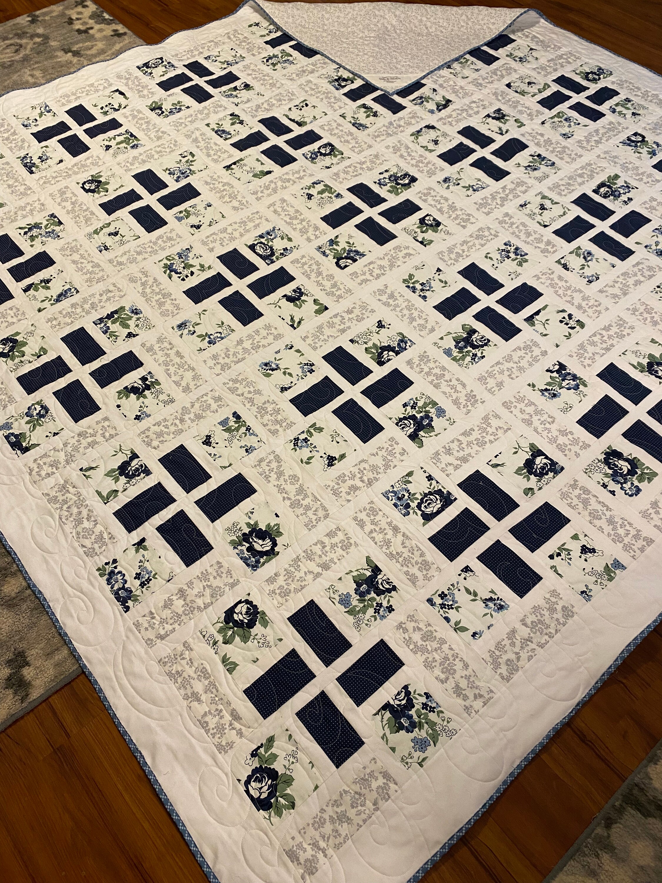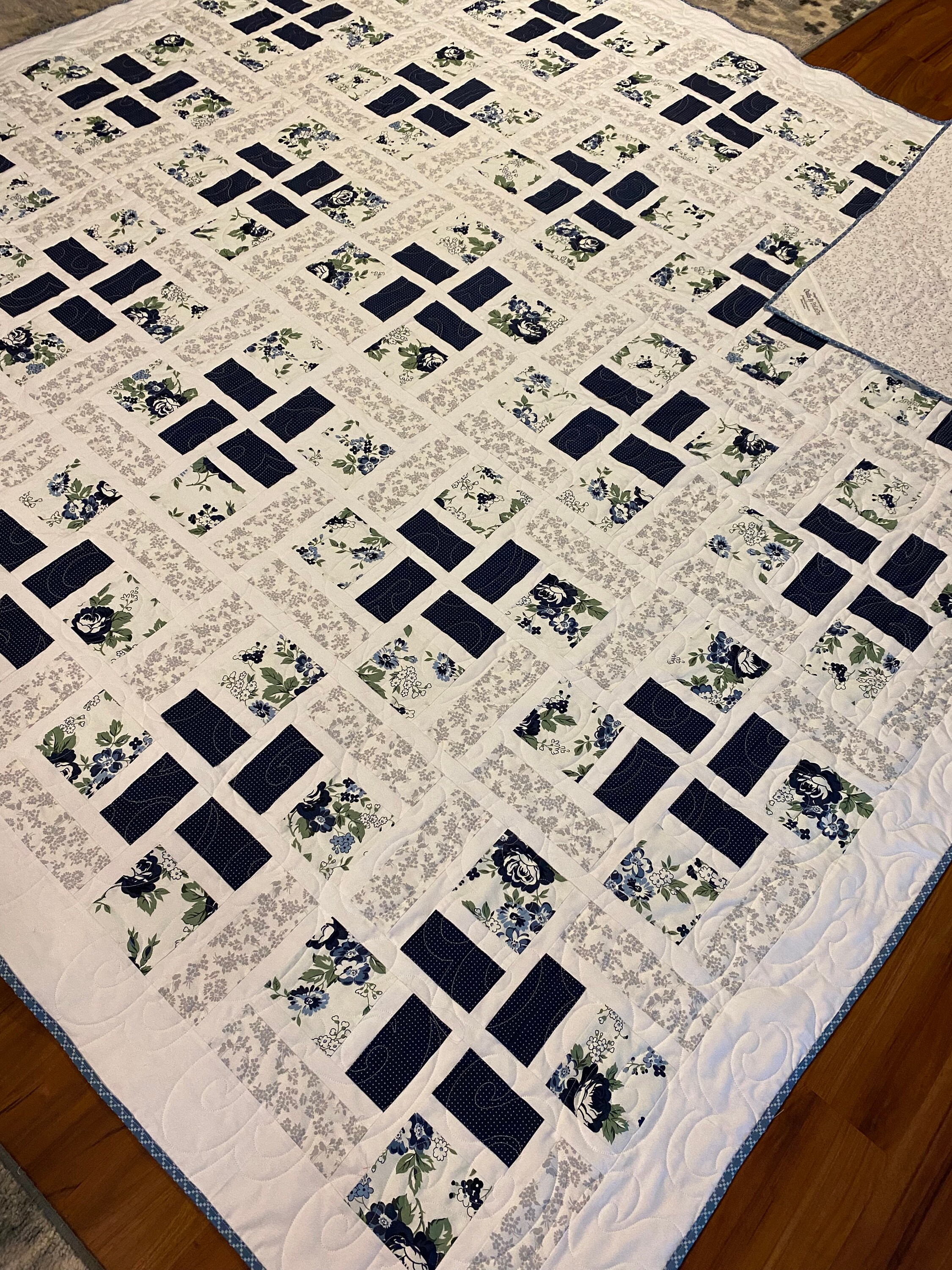 Take three colors and a background and the outcome….Simple Elegance! The simplicity of the pattern combined with the fabric prints and colors just create a beautiful quilt. I used cotton batting and a white/gray vine backing to complete this quilt.