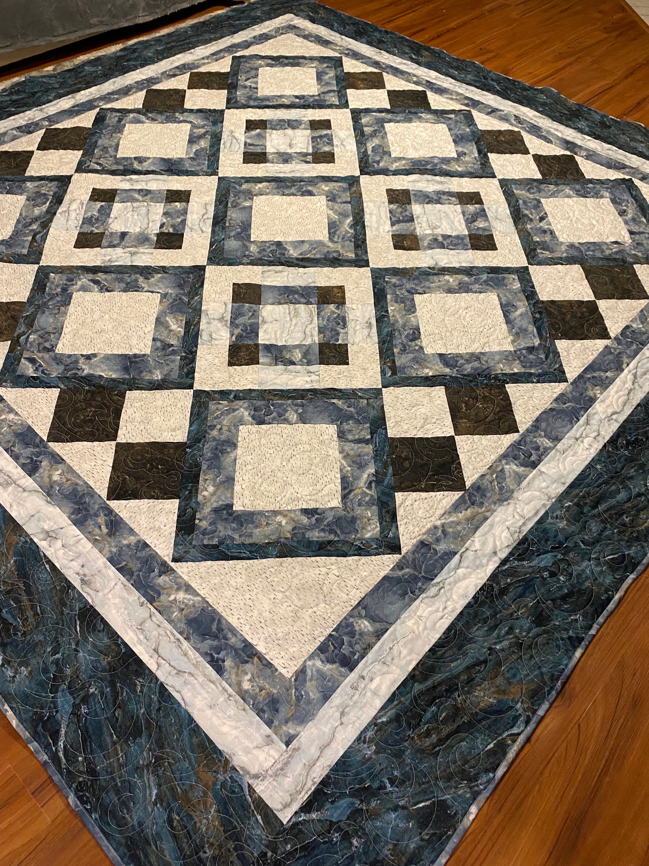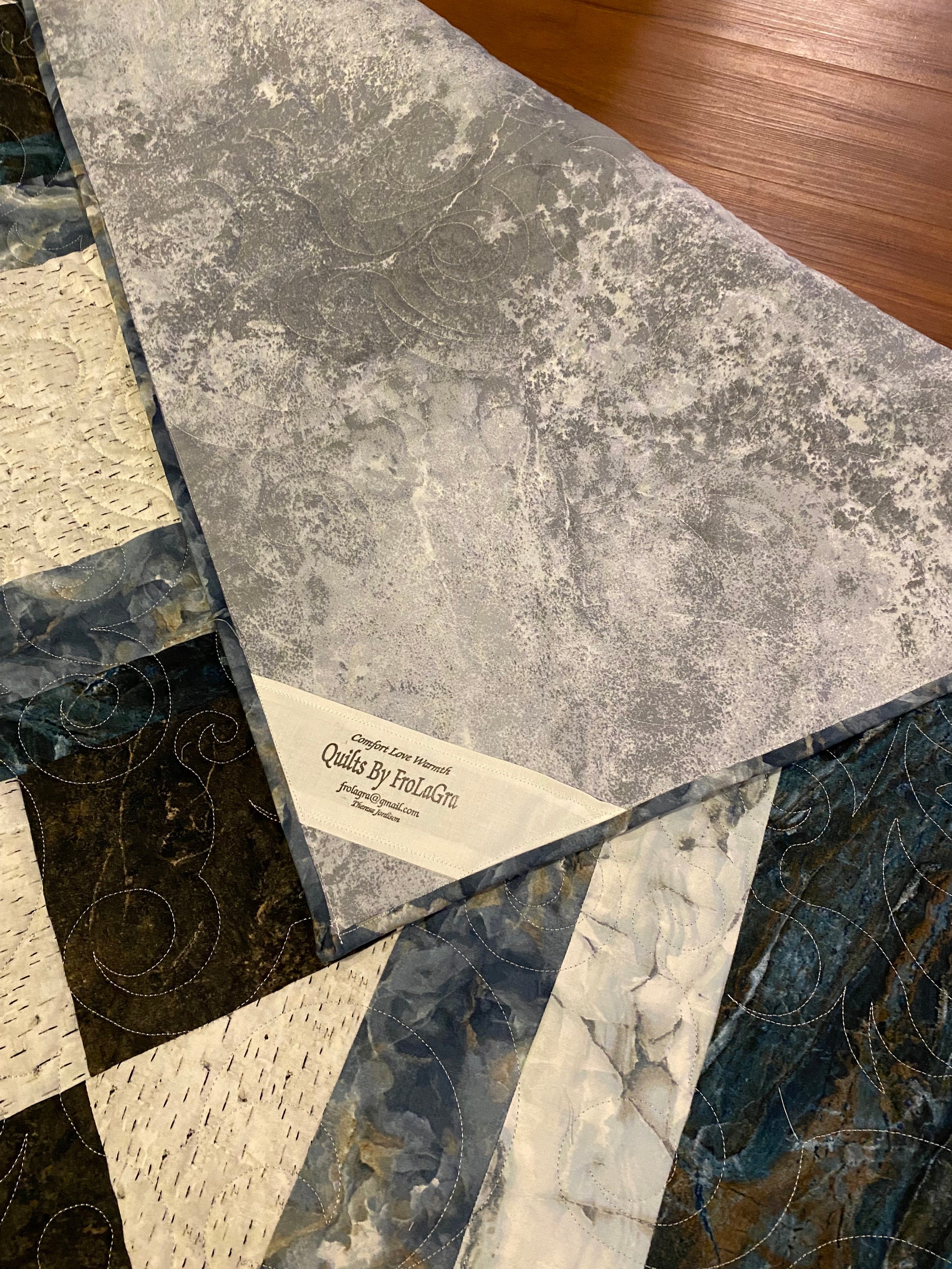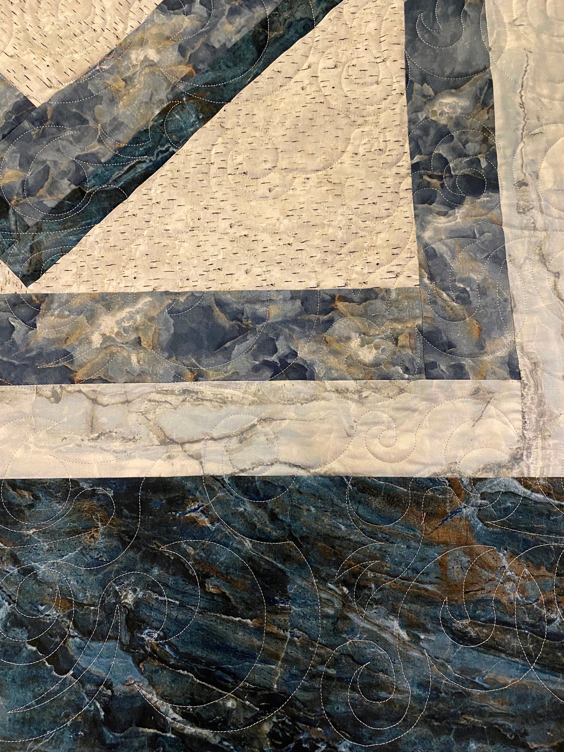 This features fabric called Stonehenge Surfaces. I see them as movement but also marble. The colors are grays, tans, and teals.